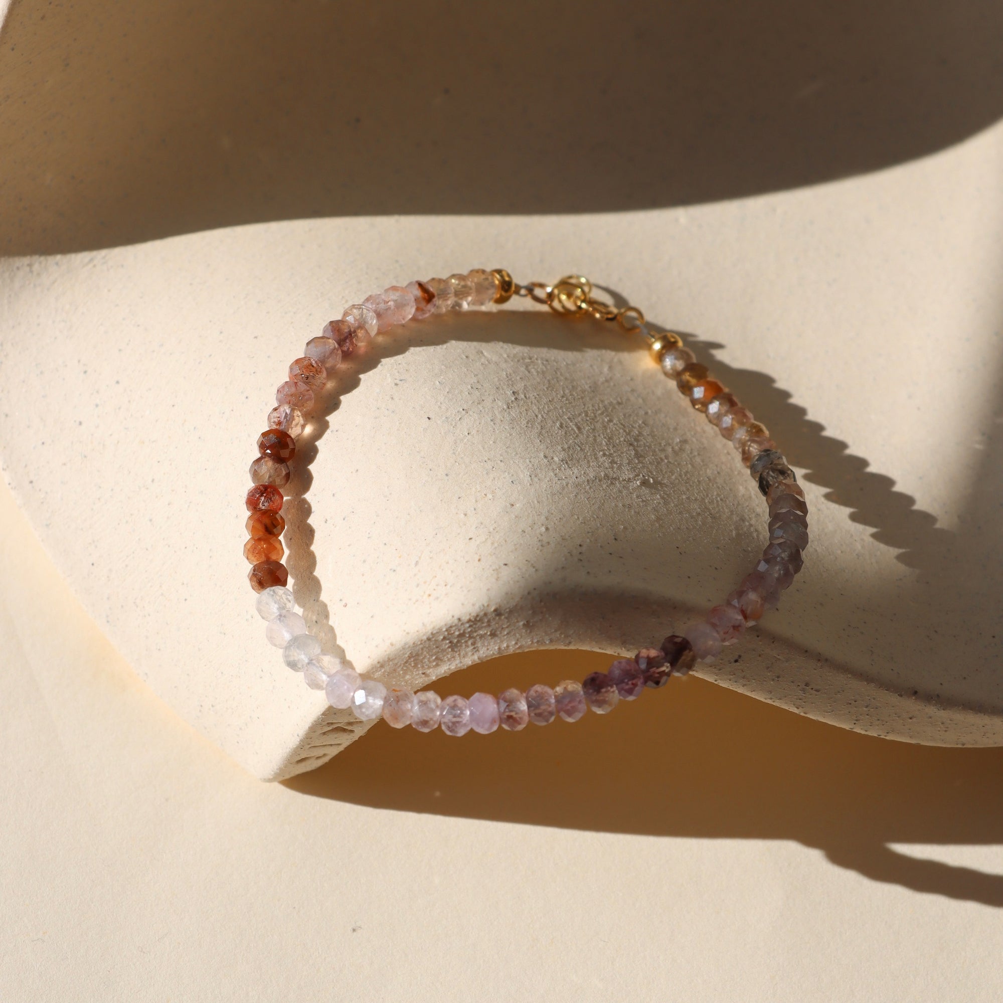 Beaded bracelet on a textured beige surface with soft shadows